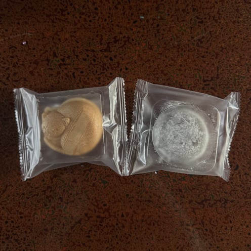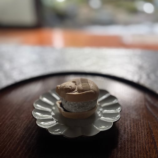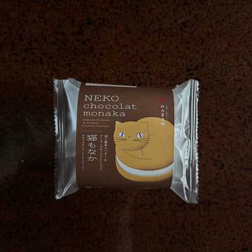 もなかの皮と羽二重あんバターに分かれ、もなかの皮が丸まったネコちゃんの形になっています。