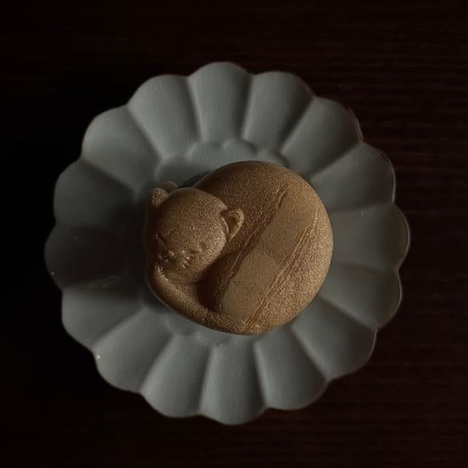 菊花皿に乗った猫もなか、絵になりますね。食べるのがもったいない気もしますが、いよいよパクリ!